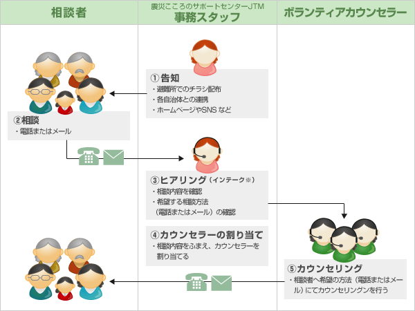避難所や各自治体と連携して当活動について告知し、こころのケアを必要としている方々から電話やメールにて相談を受け付けます。まず、事務局スタッフによる相談内容などについてヒアリングを行い、ボランティアカウンセラーへつなげ、カウンセリングを行います。
